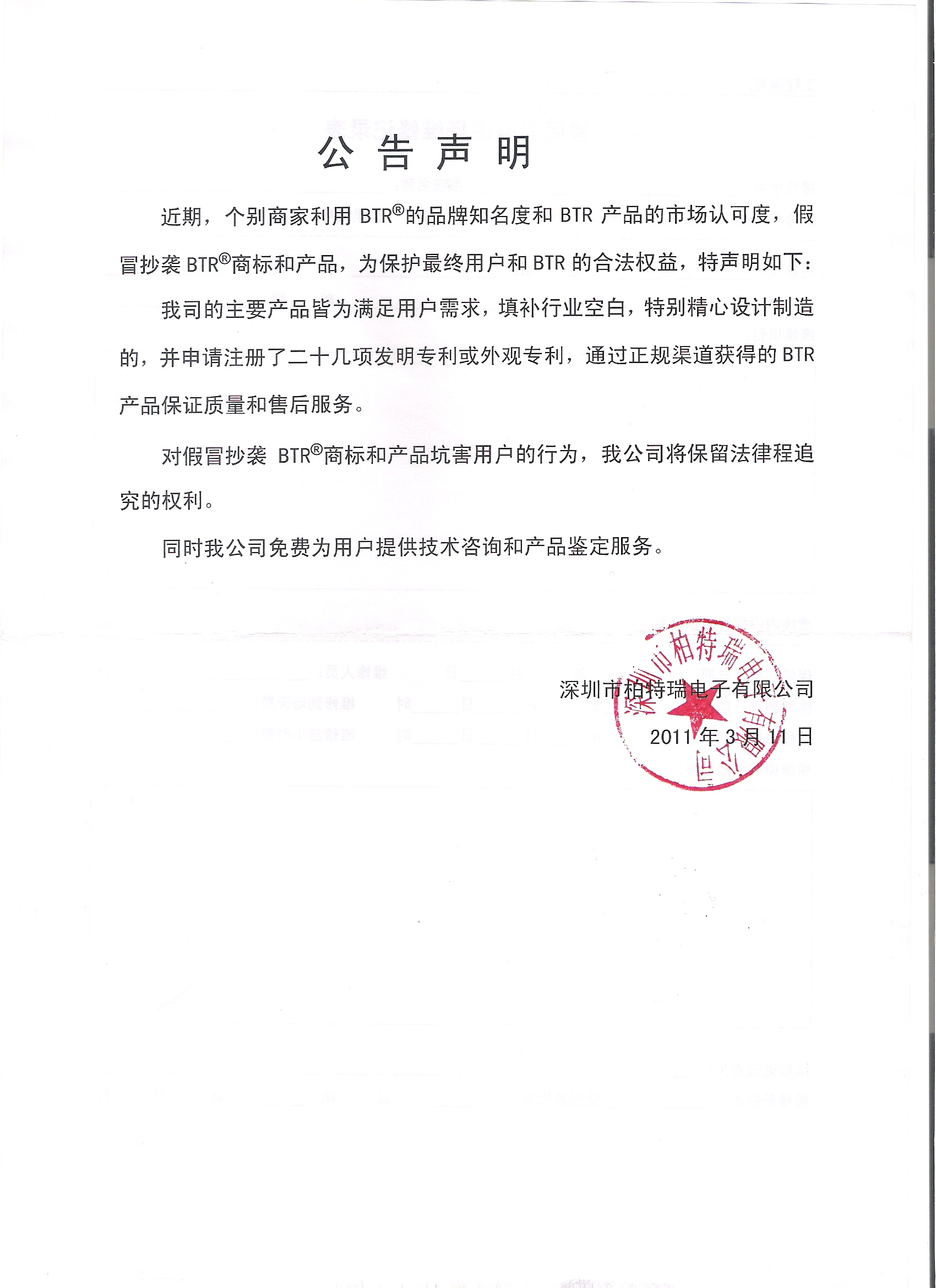 和產(chǎn)品,為保護(hù)最終用戶和BTR的合法權(quán)益,特聲明如下: